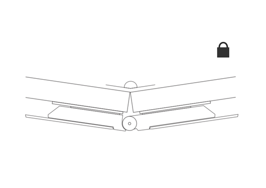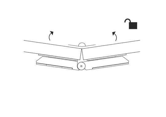 🇩🇪 Drehen der vorderen Platte um 90° nach links in eine senkrechte Position, um den gewünschten Winkel einzustellen. Fixieren des Winkels, durch das Zurücksetzen in die Ausgangsposition.